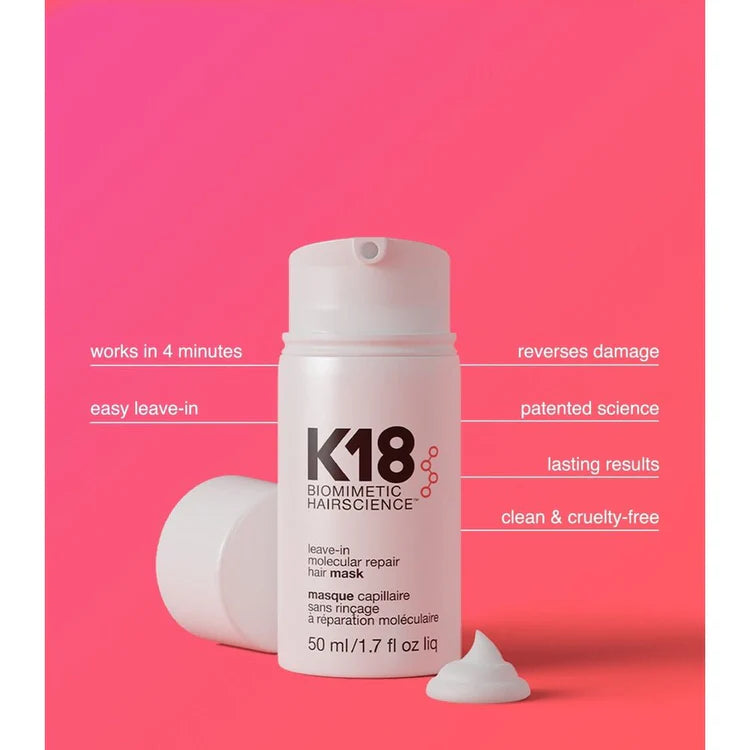 K18 هو قناع علاجي للشعر يترك على الشعر يُصلح تلفه من الداخل على المستوى الجزيئي خلال 4 دقائق فقط، باستخدام ببتيد ثوري يعيد ربط سلاسل الببتيد وروابط ثاني كبريتيد المكسورة في الشعر بسبب التبييض والصبغات والمعالجات الكيميائية والحرارة. يعمل على تجديد القوة الأساسية والمرونة للشعر، مما يجعله ناعمًا ولامعًا وسهل التسريح، ومناسبًا لجميع أنواع الشعر، خاصةً الشعر المتضرر.